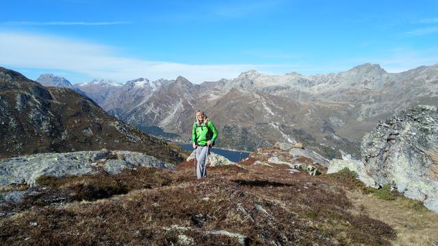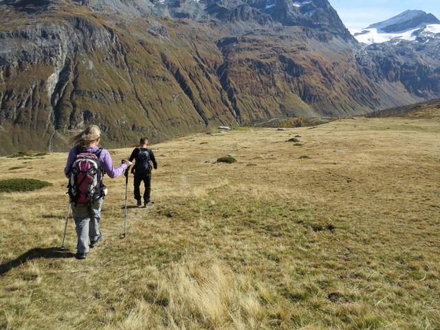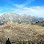 wir wandern durch das weite, sonnige Val Flex sanft abwärts. Direkt vor uns der Piz d'Emmat Dadaint Datum 30.10.2025