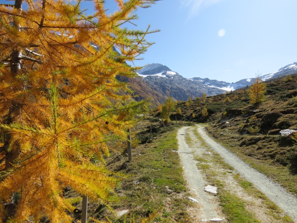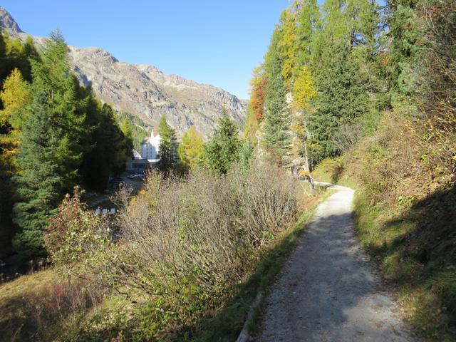 wir verlassen das Hotel Fex und laufen nun auf der Fahrstrasse nach Fex-Curtins Datum 02.11.2025