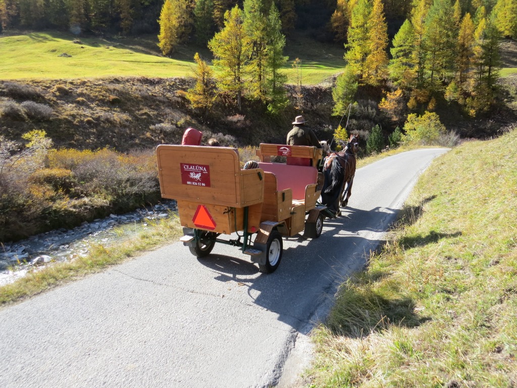 unter lautem Bimmeln und Getrappel überholen uns Pferdekutschen, die Touristen hinunter nach Sils-Maria fahren Datum 02.11.2025