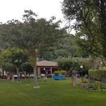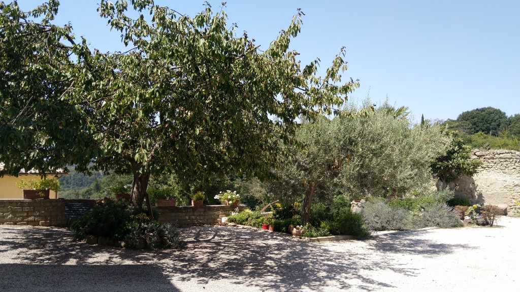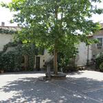 im Schatten der Bäume vor dieser schönen Kirche, legen wir eine kurze Pause ein
