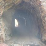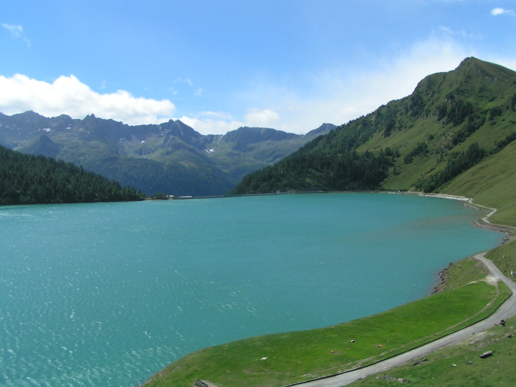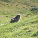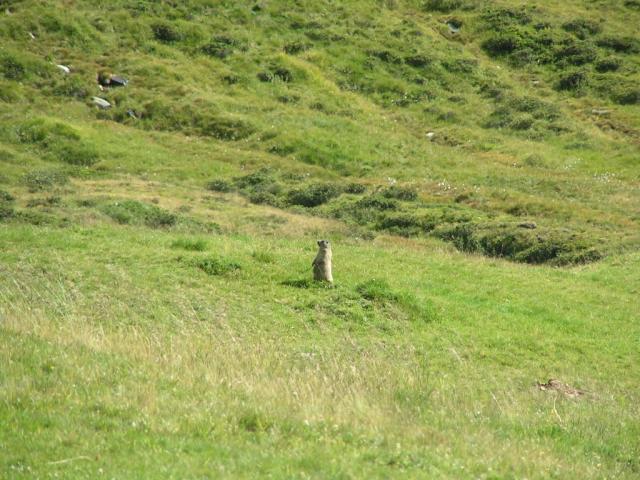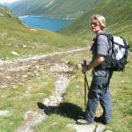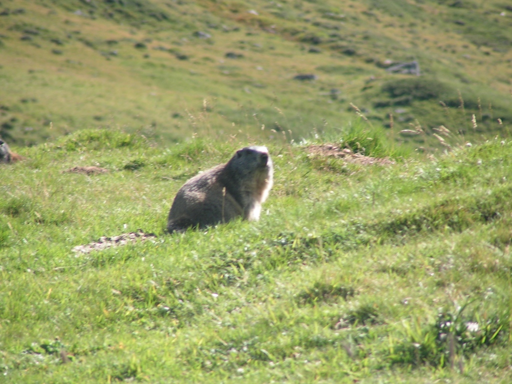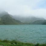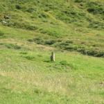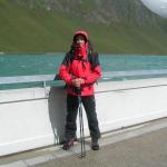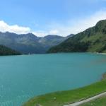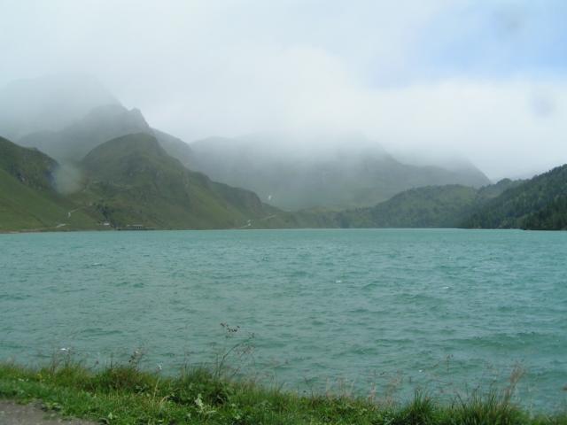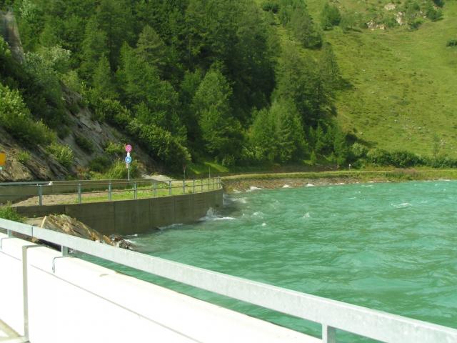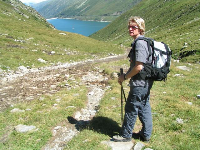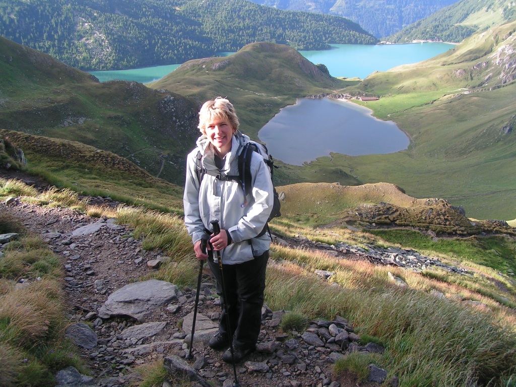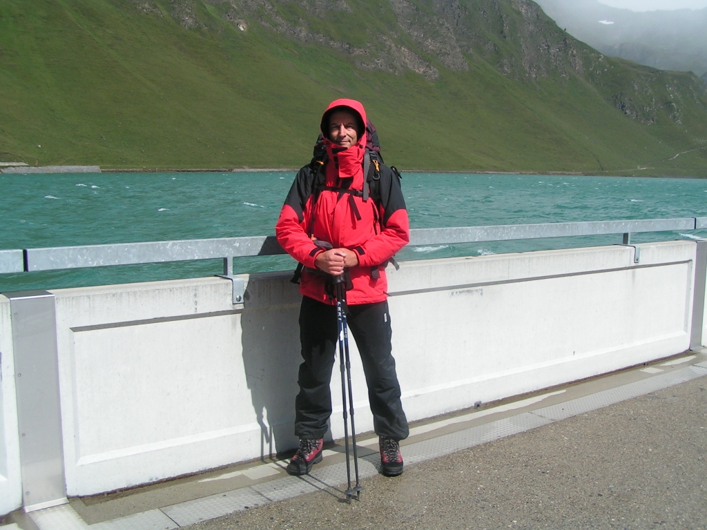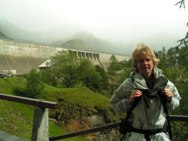 Mäusi im Hintergrund die Staumauer des Ritom See