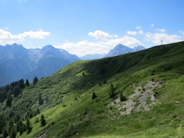 links haltend verlassen wir Motta Naluns und wandern leicht abwärts zu den Talstationen von Jonvrai