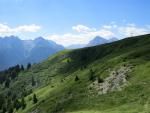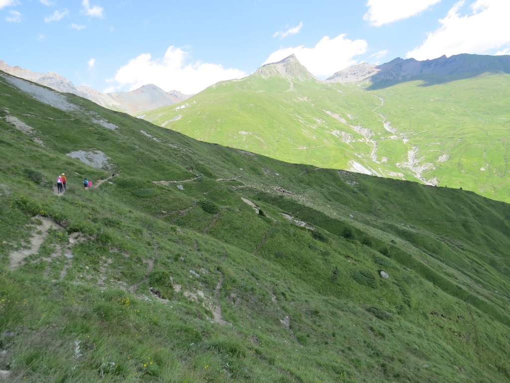 die Via Engiadina führt uns nun durch die grasbewachsene Flanke des Piz Soer weiter abwärts