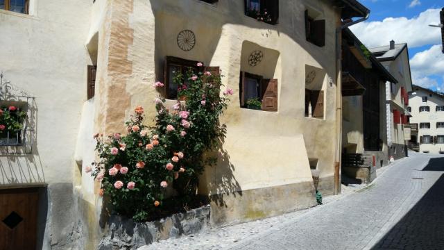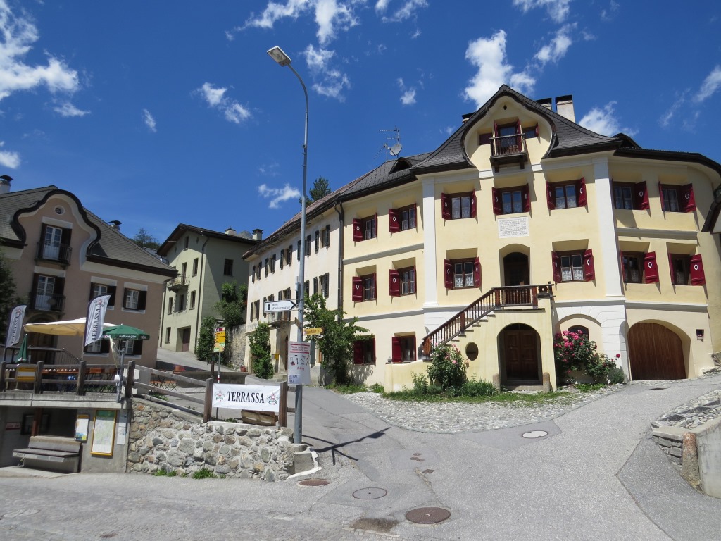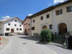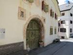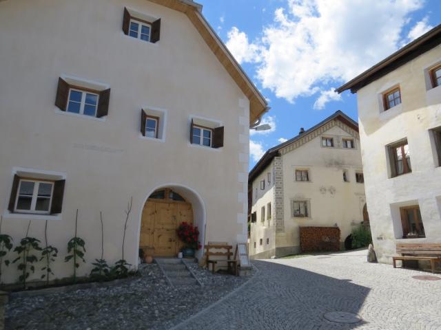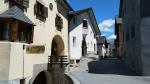 beim Dorfplatz in Sent. Wir bestaunen die stattlichen Häuser mit den geschweiften barocken Giebeln