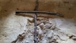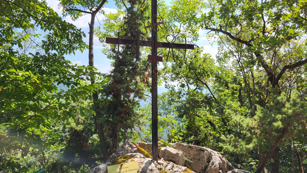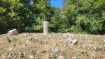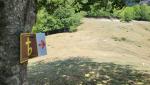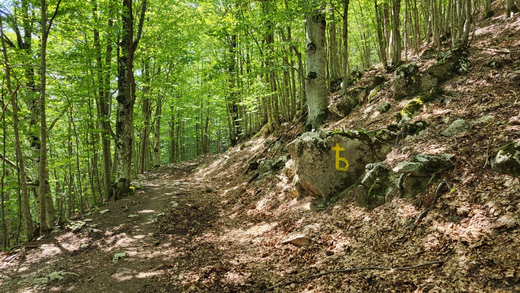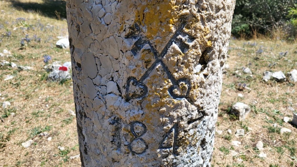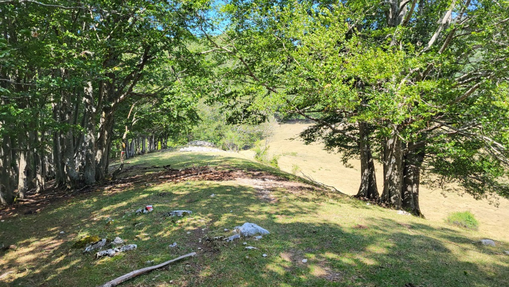 hinter dem Grenzstein führt ein Pfad hinunter zur Lichtung Petrinara...