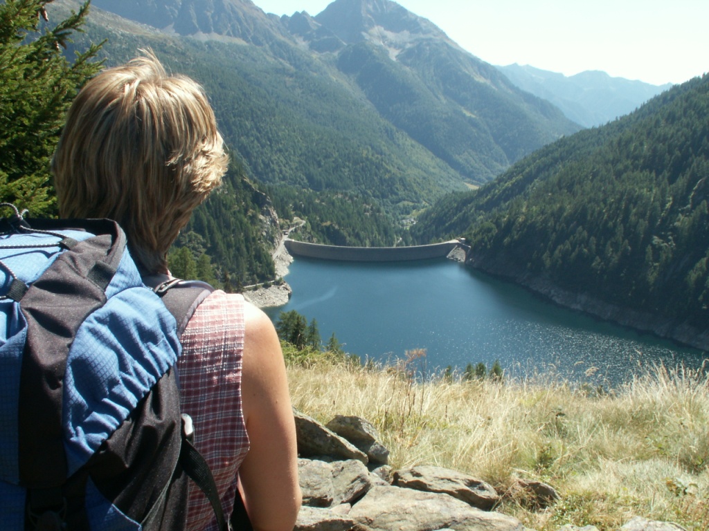 Mäusi schaut auf die Staumauer des Lago del Sambuco