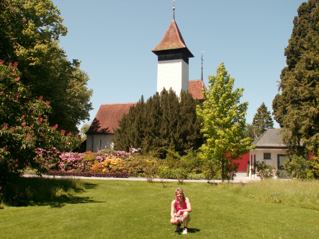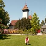 Kirche Hilterfingen mit Mönch im Hintergrund