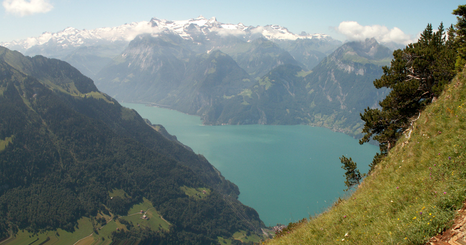 schönes Breitbildfoto vom Fronalpstock aus gesehen, mit Blick runter zum Vierwaldstättersee