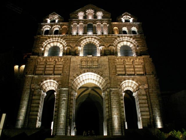 die beleuchtete Fassade der Cathédrale Notre Dame de Puy