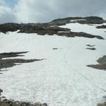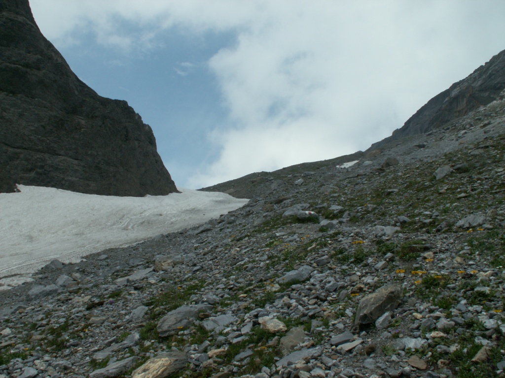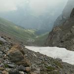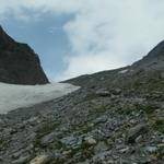 Blick von der Schlüsselstelle, auf das Schneefeld unterhalb der Claridenhütte Datum 22.07.2009
