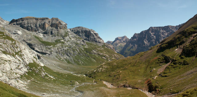 Breitbildfoto bei Ober Sand 1937 m.ü.M. mit Claridengletscher und Vorder Spitzalpelistock